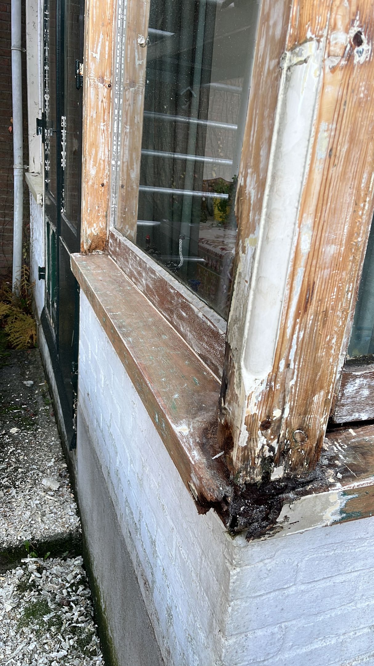 Tijdens de inspectie kwamen we verschillende punten van aandacht tegen, zoals houtrot in meerdere kozijnen en een raam dat volledig moest worden vernieuwd. Daarnaast was het iconische Vaartzicht-bordje ernstig verweerd en toe aan herstel.